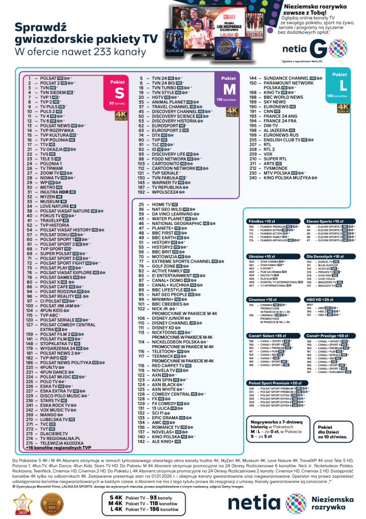 Netia daje Ci dostęp do 230+ kanałów w pakietach S, M i L. Filmy, sport, aktualności, dokumenty i bajki dla dzieci – każdy znajdzie coś dla siebie, a wszystko w jakości HD i 4K.